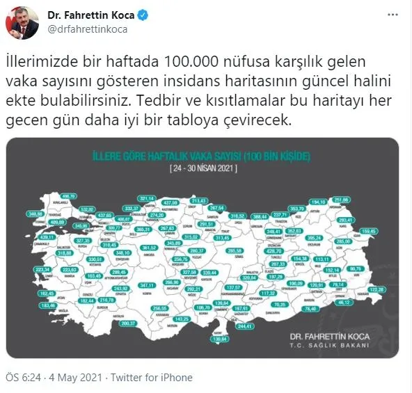 Bakan Koca, "İllerimizde bir haftada 100.000 nüfusa karşılık gelen vaka sayısını gösteren insidans haritasının güncel halini ekte bulabilirsiniz. Tedbir ve kısıtlamalar bu haritayı her gecen gün daha iyi bir tabloya çevirecek" dedi.