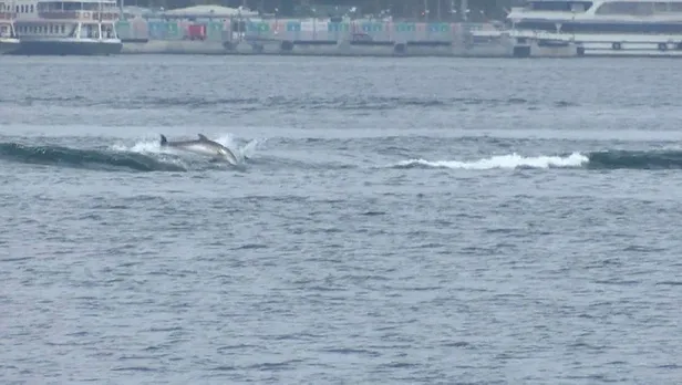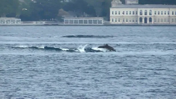 Üsküdar Sahili'nden denizde dalgalarla dans eden yunuslar görüntülendi. Gemilerin oluşturduğu dalgalarla dans eden yunuslar Kız Kulesi yakınlarında yüzdü. Defalarca suyun üstüne çıkan yunuslar bir süre sonra gözden kayboldu.