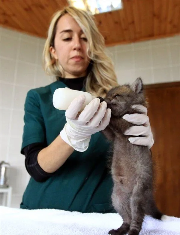 Klinikte 3 haftadır tilki yavrusunu biberonla süt vererek besleyen veteriner, ek gıda olarak da köpek maması veriyor.