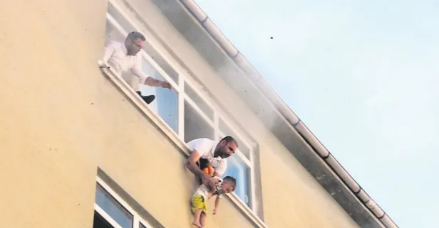 Yanan eve ulaşan bir vatandaş, dumandan etkilenen bebeği kurtarmak için 5. katın penceresinden aşağı sarkıttı. İtfaiye de evde mahsur kalanları merdivenle kurtardı.