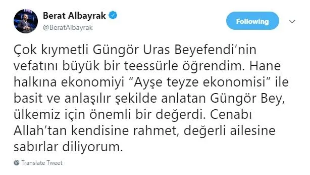 Albayrak'ın mesajında şu ifadeleri kullandı: "Çok kıymetli Güngör Uras Beyefendi'nin vefatını büyük bir teessürle öğrendim. Hane halkına ekonomiyi "Ayşe teyze ekonomisi" ile basit ve anlaşılır şekilde anlatan Güngör Bey, ülkemiz için önemli bir değerdi. Cenabı Allah'tan kendisine rahmet, değerli ailesine sabırlar diliyorum."