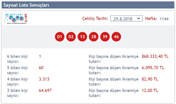 29 AĞUSTOS SAYISAL LOTO ÇEKİLİŞ SONUÇLARI