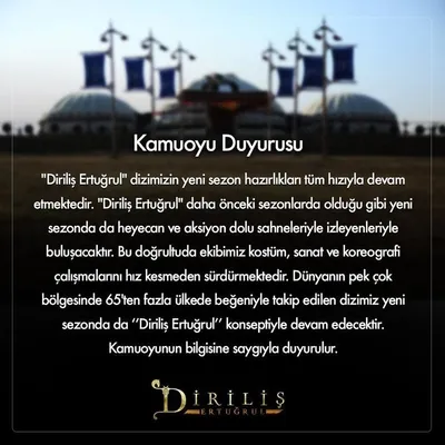 "Kamuoyu Duyurusu! Diriliş Ertuğrul" dizimizin yeni sezon hazırlıkları tüm hızıyla devam etmektedir. "Diriliş Ertuğrul" daha önceki sezonlarda olduğu gibi yeni sezonda da heyecan ve aksiyon dolu sahneleriyle izleyenleriyle buluşacaktır. Bu doğrultuda ekibimiz kostüm, sanat ve koreografi çalışmalarını hız kesmeden sürdürmektedir. Dünyanın pek çok bölgesinde 65'ten fazla ülkede beğeniyle takip edilen dizimiz yeni sezonda da ''Diriliş Ertuğrul'' konseptiyle devam edecektir. Kamuoyunun bilgisine saygıyla duyurulur."