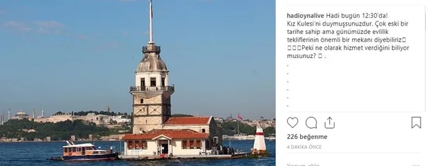 Kız Kulesi ne olarak hizmet veriyor sorusu araştırılıyor. Hadi ipucu 21 Eylül sorusu yayında. 21 Eylül'de Hadi'de ipucu olarak, "Kız Kulesi'ni duymuşsunuzdur. Çok eski bir tarihe sahip ama günümüzde evlilik tekliflerinin önemli bir mekanı diyebiliriz. Peki ne olarak hizmet verdiğini biliyor musunuz?" sorusu soruldu vatandaşlar cevabı aramaya başladılar. Antik Çağ'da Arkla(küçük kale) ve Damialis(dana yavrusu) adları ile anılan Kule, bir ara da "Tour de Leandros"(Leandros'un kulesi) ismi ile ün yapmış, günümüzde ise Kızkulesi – Maiden's Tower ismi ile bütünleşmiştir. 1995 yılında Kızkulesi'nin restorasyon süreci başlar. Binlerce yıllık gizemli bir tarihe sahip bu özel mekan, kendine özgü kimliğine ve geleneksel mimarisine bağlı kalarak tamamlanan restorasyon çalışması sonrasında 2000 yılında kapılarını ziyarete açar. Bugün gündüzleri cafe-restaurant, akşamları ise özel restaurant olarak yerli ve yabancı ziyaretçilerine hizmet veren Kızkulesi, düğün, toplantı, lansman, iş yemeği gibi pek çok özel davet ve organizasyona da ev sahipliği yapmaktadır. Geçtiğimiz haftalarda AppStore'larda yerini alan HADİ artık Androidlerin de cebine girdi. Binlerce kişi tarafından aynı anda canlı oynanabilen yarışma; günde iki kez yayınlanıyor. Yarışmacıların binlerce lira gerçek parayı 12 soruyu bilmeleri durumunda kazandığı yarışmada; eğlence ve heyecan bir arada. Her gün aynı saatte sadece on iki soruluk yarışma boyunca canlı yayınlanan yarışmaya erişmek için Hadi uygulamasını indirmek yeterli. Uygulamayı kullanmak ise tamamen ücretsiz.