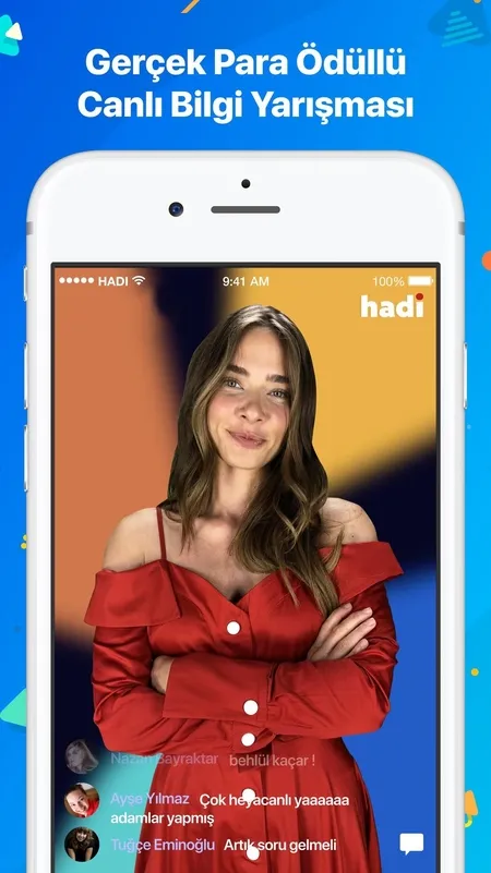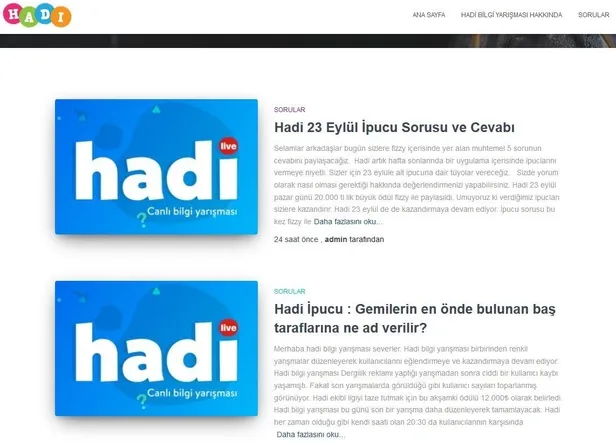 Geçtiğimiz haftalarda AppStore'larda yerini alan HADİ artık Androidlerin de cebine girdi. Binlerce kişi tarafından aynı anda canlı oynanabilen yarışma; günde iki kez yayınlanıyor. Yarışmacıların binlerce lira gerçek parayı 12 soruyu bilmeleri durumunda kazandığı yarışmada; eğlence ve heyecan bir arada. Her gün aynı saatte sadece on iki soruluk yarışma boyunca canlı yayınlanan yarışmaya erişmek için Hadi uygulamasını indirmek yeterli. Uygulamayı kullanmak ise tamamen ücretsiz. Yapılması gereken tek şey, daha önce bildirilen yarışma saatinde uygulamayı açık tutmak. Akabinde telefon ekranını dolduran sunucu; canlı yayında soruları ardı sıra soracak; oyuncular ise çoktan seçmeli cevapları tek bir tık ile yanıtlayacak. Yanıtlama süresi ise on saniye. Yarışma sırasında yarışmacılar canlı yayında yazışabiliyor, arkadaşını yarışmaya üye edenler ise ekstra can hakkı kazanıyor.