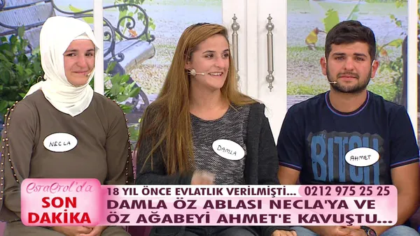 Esra Erol'da programında yine bir mucize gerçekleşti! 18 yaşındaki Damla Arıcı hiç görmediği öz ailesine Esra Erol sayesinde kavuştu. Damla Arıcı, 27 Eylül Perşembe günü yıllardır hiç görmediği kardeşlerini ilk defa Esra Erol’da gördü. Kendisi haricinde iki kardeşi daha olduğunu öğrenen Damla, ablası ve abisiyle Esra Erol’da programında tanıştı.