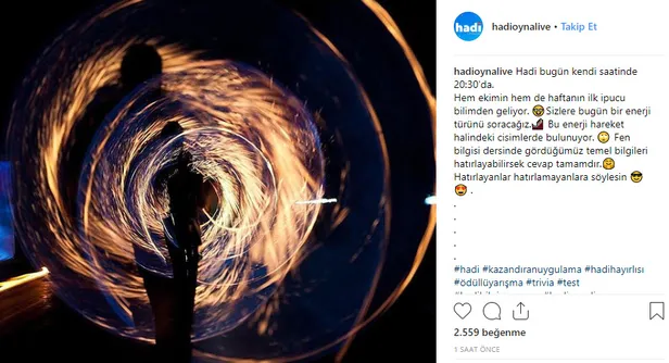 Turkcell'in Hadi yarışması yayınlandığı günden bu yana sosyal medyayı kasıp kavuruyor. Yarışmanın ipucu soruları da araştırılmaya devam ediyor. Hadi 1 Ekim ipucu sorusunun cevabı bugün en çok aratılanlar listesine girdi. Peki hareket halindeki cisimlerde bulunan enerji türü nedir? İşte Hadi ipucu sorusunun cevabı...