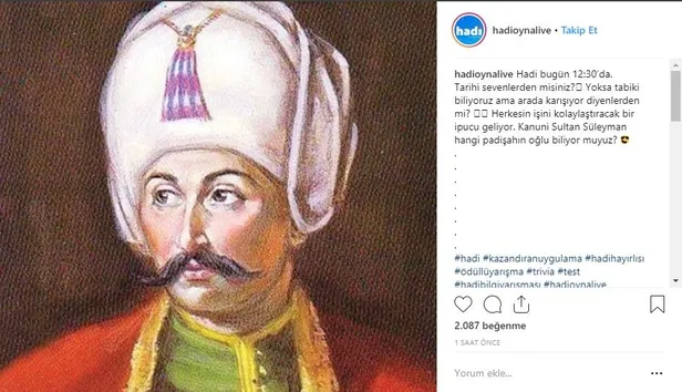 Hadi ipucu 4 Ekim sorusu ve cevabı nedir ne oldu? Kanuni Sultan Süleyman hangi padişahın oğlu? Heyecanla oynanan Hadi 4 Ekim ipucu! Kanuni Sultan Süleyman hangi padişahın oğludur kimdir? Hadi 4 Ekim 2018 sorusu ve cevabı haberimizde yer alıyor. Milyonlarca kişinin oynadığı Hadi yarışması kullanıcılar tarafından büyük beğeni ile kullanılıyor. Hadi bilgi yarışması haftanın her günü birbirinden renkli yarışmalar düzenlemeye devam ediyor. Hadi ekibi öğlenki yarışın ardından 2 yarış daha düzenleyerek bu günkü yayınını tamamlamayı planlıyor. Hadi bilgi yarışması ekibi saat 19:30 da yeni konsep ti olan resim yarışması ile karşımızda olacak. Kullanıcılarını resim yarışması ile ısındırmayı planlayan hadi ekibi büyük yarışı olan 15 zor soru yarışını ise her zaman olduğu gibi kendi saati olan 12:30' da yayınlayacak. BiP üzerinden oynayabileceğin Hadi uygulaması için, Türk mühendisler tarafından geliştirilen BiP'in esnek ve gelişmiş yetenekleriyle keşfet kategorisinde yer alan Hadi Bilgi Yarışması kanalı açıldı. Yaklaşık 1 milyon takipçisi bulunan bu servis üzerinden BiP'lilere yarışmaya ait en son bilgiler iletilir aynı zamanda her hafta BiP uygulamasından Hadi Bilgi Yarışması'nda kullanabilecekleri 'Joker' hakkı (ekstra can hakkı) ve yarışmada sorulacak sorularla ilgili bazı ipuçları verilmekte.