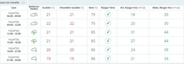İstanbul hava durumu ile ilgili yayınlanan son dakika tahmin raporunda bugün, 15 Ekim Pazartesi günü saat 12.00 - 18.00 arasında sağanak yağış bekleniyor. Öte yandan yağışların saat 18.00 - 24.00 arasında ise "mevzi sağanak yağış" şeklinde devam etmesi bekleniyor. Mevzi sağanak yağışın Marmara Bölgesi'ndeki birçok ili etkileyeceği tahmin ediliyor.