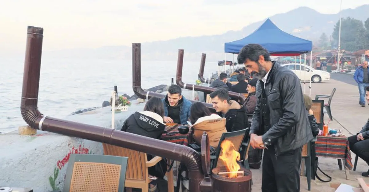 Rize'de sahilde hizmet veren kafeteryaların işletmecileri, soğukta müşterilerine daha iyi hizmet vermek için yeni bir uygulama başlattı. Açık alandaki masaların arasına soba kuran işletmeciler, böylelikle müşterilerinin ısınma sorununu çözdü. Ortaya çıkan görüntü ise herkesi şaşırttı.