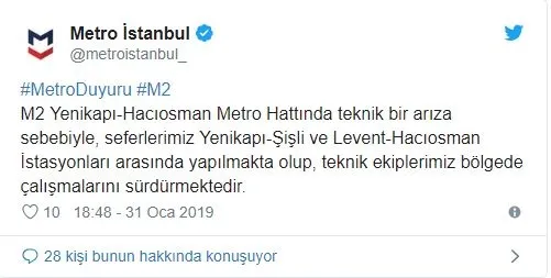 Metro İstanbul'dan konuya ilişkin açıklama geldi. Yapılan açıklamada; "M2 Yenikapı-Hacıosman Metro Hattında teknik bir arıza sebebiyle, seferlerimiz Yenikapı-Şişli ve Levent-Hacıosman İstasyonları arasında yapılmakta olup, teknik ekiplerimiz bölgede çalışmalarını sürdürmektedir." ifadelerine yer verildi.