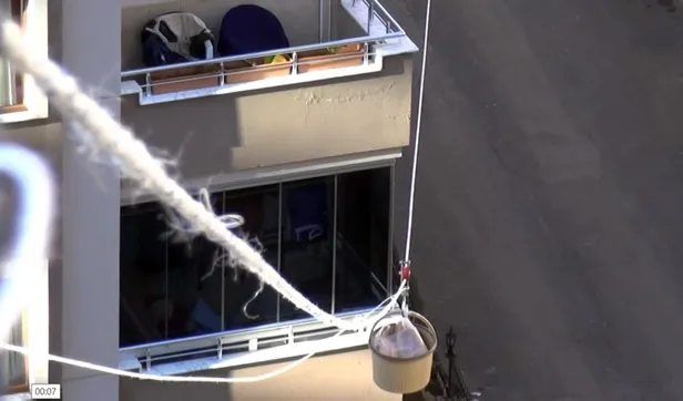 Telefon ile markettekileri arayıp ihtiyaçlarını bildiren Gökdemir, parayı sepete koyup marketteki görevliye gönderiyor, ardından sepete konan malzemeleri iple balkona çekiyor.