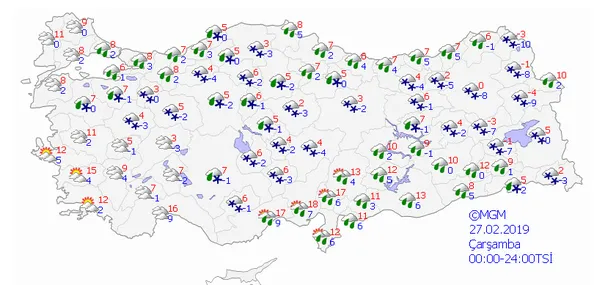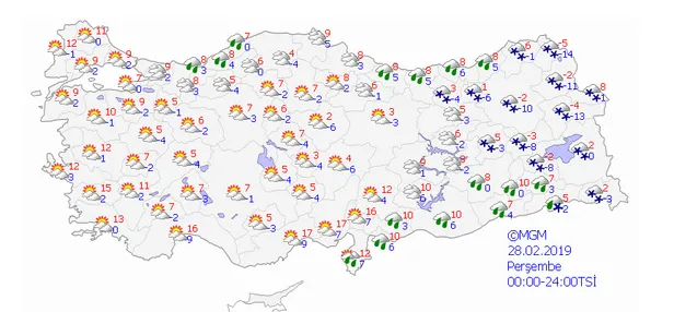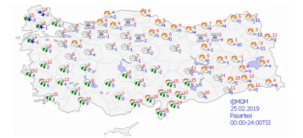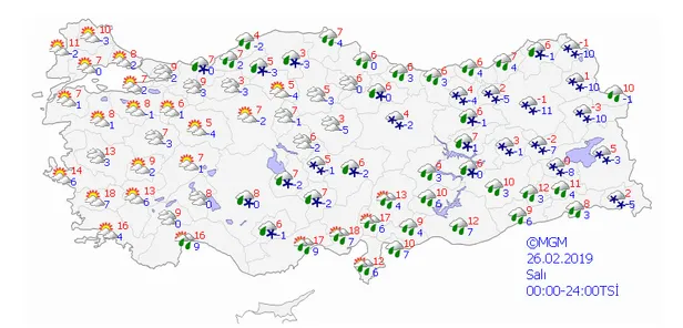 Yapılan son değerlendirmelere göre, ülke genelinin parçalı ve çok bulutlu, Marmara, Kıyı Ege, Akdeniz'in kıyı kesimleri, Batı Karadeniz, Orta ve Doğu Karadeniz'in kıyı kesimleri, Çankırı, Osmaniye, Gaziantep ve Kilis çevreleri ile Ankara'nın doğu kesimlerinin yağışlı geçeceği tahmin ediliyor. Yağışların genellikle yağmur ve sağanak, Marmara, Batı Karadeniz, Çankırı ile Ankara'nın doğu kesimlerinde karla karışık yağmur ve kar şeklinde olması bekleniyor. Doğu Anadolu'nun kuzey kesimlerinde buzlanma ve don olayı ile birlikte yurdun iç ve doğu kesimlerinde sabah ve gece saatlerinde yer yer sis ve pus bekleniyor.