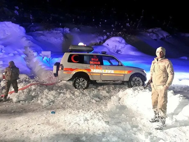 İhbarla birlikte harekete geçen 112 Acil Servis ekipleri, bölgede 3 gündür etkili kar yağışı nedeniyle yolu kapanan köye ulaşmaya çalışırken ambulans kara saplandı.