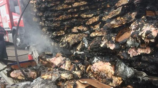 Yaralanın olmadığı yangında TIR kullanılamaz hale gelirken, yanan tavuk etleri nedeniyle de etrafa kötü koku yayıldı.