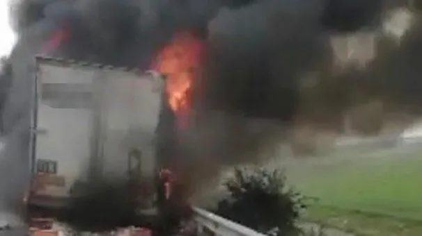 Son dakika: Şanlıurfa'da tavuk eti yüklü TIR alev alev yandı