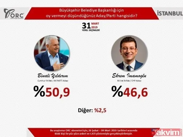 Son ankete göre, Binali Yıldırım ve Ekrem İmamoğlu'nun yarıştığı İstanbul'da, AK Parti İstanbul Büyükşehir Belediye Başkan adayı Binali Yıldırım yarışı önde götürüyor.