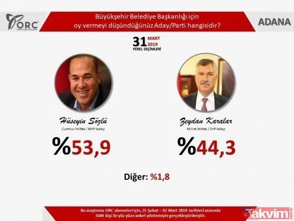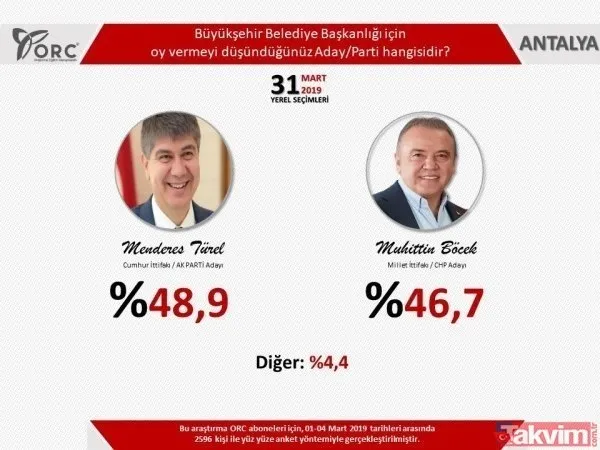 ORC Araştırma Şirketi, 31 Mart yerel seçimlerine sayılı günler kala İstanbul, İzmir, Antalya illerini kapsayan araştırmasının sonuçlarını kamuoyu ile paylaştı.
