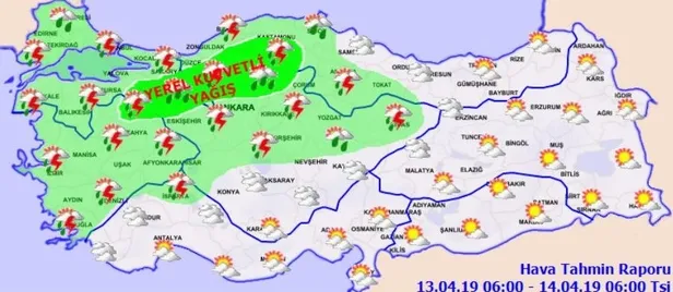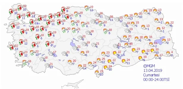 13 Nisan 2019 Cumartesi son dakika hava durumu tahminleri... Meteoroloji Genel Müdürlüğü'nün internet sitesi üzerinden yayınlanan raporlarda bugün bir çok il için sağanak yağış uyarısında bulunuldu. Vatandaşlara; sel, su baskını, yıldırım, ani ve kuvvetli rüzgarlar konusunda uyarı yapıldı. Peki İstanbul, Ankara ve İzmir'de bugün hava nasıl olacak? İşte 13 Nisan 2019 Cumartesi Türkiye geneli hava durumu...
