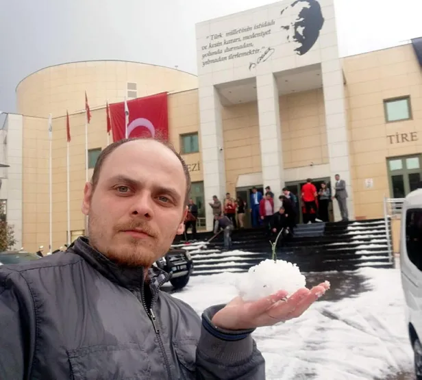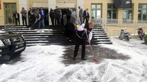 İzmir’in Tire ilçesinde öğle saatlerinde başlayan sağanak yağış bir anda yerini doluya bıraktı. Yaklaşık 20 dakika süren dolu yağışıyla, ilçe kar yağmış gibi bir anda beyaza büründü.