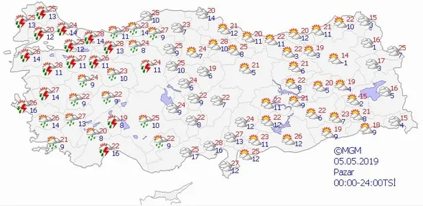 5 Mayıs Pazar günü için yurt genelinde beklenen hava durumu tahmini ise şu şekildedir: