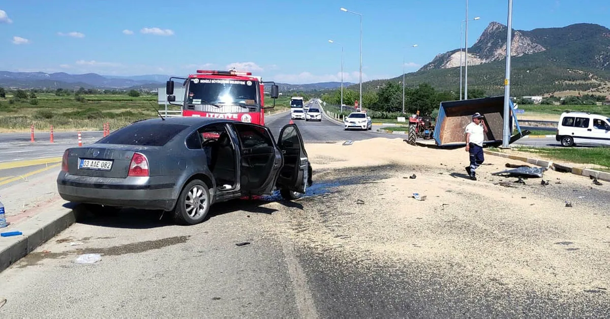 Kaza, bugün saat 19.30 sıralarında Kacabaş Mahallesi Cezaevi kavşağında meydana geldi. Afyonkarahisar'dan Denizli istikametine giden Serdar Abacı yönetimindeki 03 AAE 082 plakalı otomobil, cezaevi kavşağında yola çıkan İbrahim Serbest'in kullandığı 20 H 1667 plakalı traktörle çarpıştı. Çevredekilerin ihbarı üzerine olay yerine ambulans, itfaiye ve jandarma ekipleri sevk edildi.