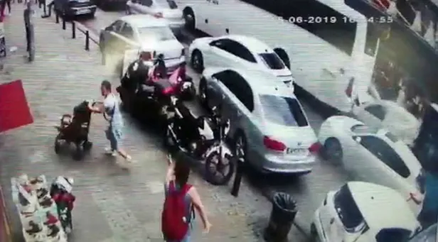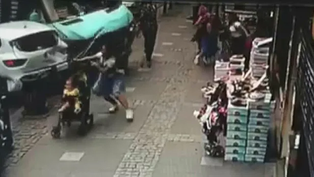 Kaza anı ise cadde üzerinde bulunan bir iş yerinin güvenlik kameralarına saniye saniye yansıdı. Görüntülerde kaza yapan araçlar kaldırıma doğru sürükleniyor. Bu sırada kaldırımda bebek arabasıyla yürüyen bir kadın son anda kaçıyor. Kaldırımda yürüyen başka yayalar da büyük korku yaşıyor. Çevredekiler kaza sonrasında yardım için araçların yanına gidiyor.
