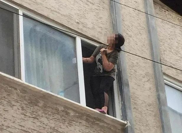 Çıktığı pencerede, boğazına bıçak dayayıp intihara kalkıştı