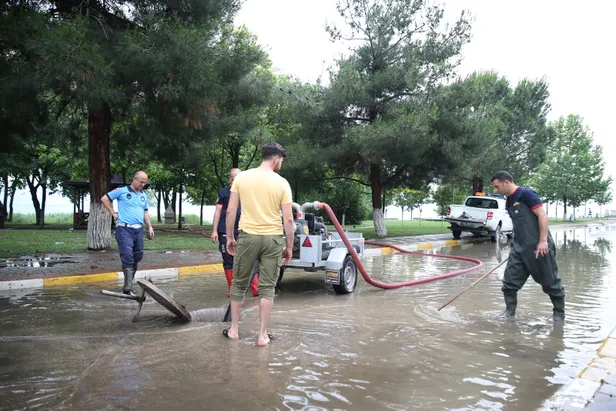 Aynı bölgedeki 10 aracın da biriken suya gömüldüğü görüldü. Esnaf, kendi imkanlarıyla iş yerlerinden suyu tahliye etmeye çalıştı.