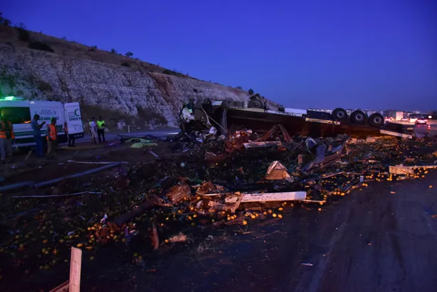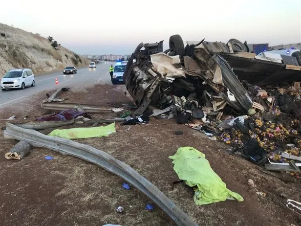Gaziantep'te kontrolden çıkan TIR orta bariyerlere çarparak devrildi. Kazanın ardından yol savaş alanına dönerken, TIR'da bulunan 3 kişi öldü. Polis kazayla ilgili soruşturma başlattı.