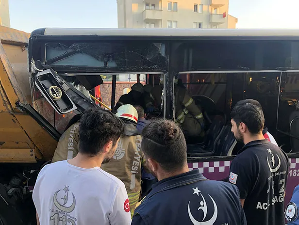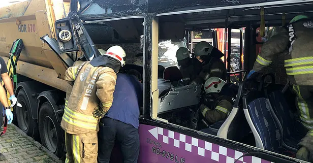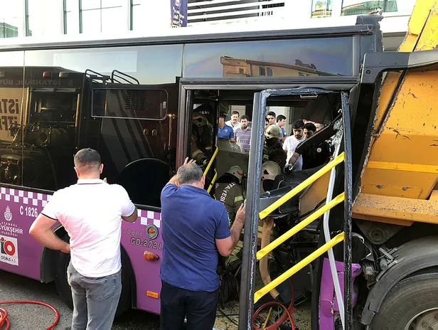 Sancaktepe'de sürücüsünün direksiyon hakimiyetini kaybettiği özel halk otobüsü park halindeki hafriyat kamyonuna çarparak durabildi. Şoför mahallinde sıkışan sürücü, itfaiye ekiplerinin bir saatlik çalışmasının ardından kurtarıldı.