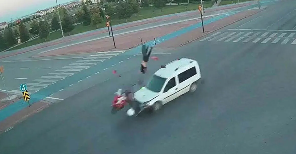 Konya'da hafif ticari aracın çarptığı motosiklet sürücüsünün havaya uçması ve bir otomobilin çarpmasından son anda kurtulan vatandaşın görüntüsü şehir polis kameralarına yansıdı.