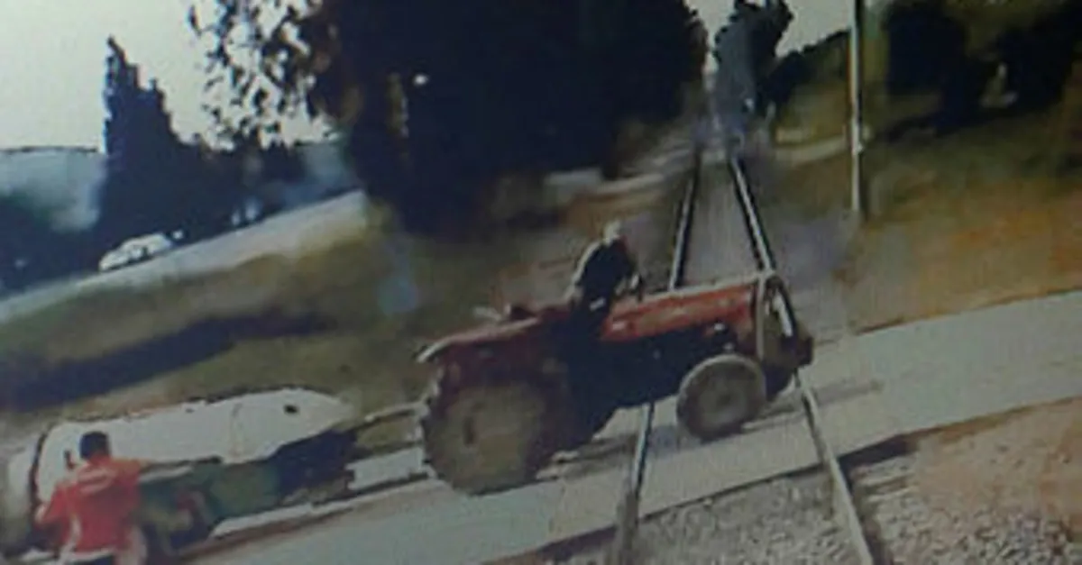 Erzin ilçesi Yeşiltepe hemzemin geçidinde, 4 Ağustos'ta yük treninin karşıya geçmeye çalışan Sedat Kozak'ın (45) kullandığı traktöre çarpma anı trenin güvenlik kamerasınca kaydedildi.