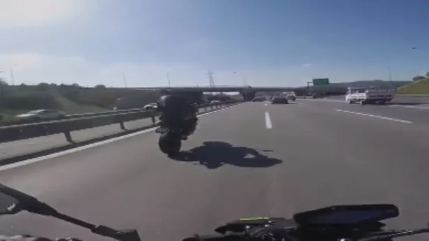 Geçen salı günü kaydedilen görüntülerde önce bir motosikletli, en sağ şeritten ön tekerini kaldırarak hızla ilerliyor. Ardından başka bir motosikletli, sol şeritte süratle ilerlerken tek tekerini kaldırıyor.