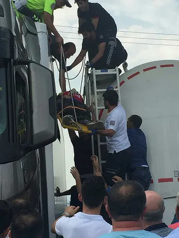Çevredekiler ve sağlık ekipleri, hemen TIR'ın üzerine çıkıp, bayılan kadını sedyeyle indirdi. Bu sırada kadının eşi de olay yerine koşarak geldi. Kadın, ambulansa alınarak, hastaneye kaldırıldı.