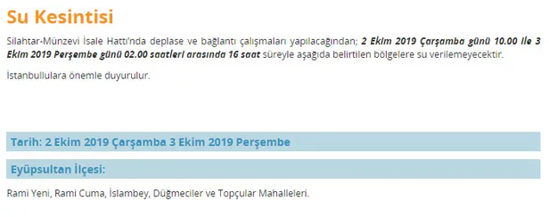 Çalışma nedeniyle Eyüpsultan'da Rami Yeni, Rami Cuma, İslambey, Düğmeciler ve Topçular mahallelerine su verilmeyecek.