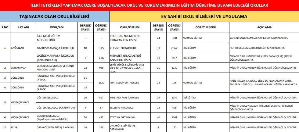 İstanbul İl Milli Eğitim Müdürlüğü, deprem sonrası 6 ilçede bulunan 10 okul binasının detaylı inceleme ve tetkikler yapılması için boşaltılacağını açıkladı. Okullarda eğitim öğretim gören öğrencilerin, geçici olarak çevre okullara yönlendirildiği bildirildi.