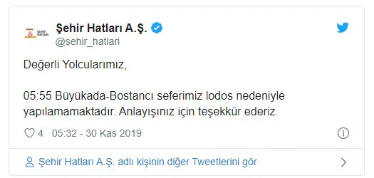 Şehir Hatları AŞ'nin Twitter hesabından yapılan açıklamada, 05.55'deki Büyükada-Bostancı vapur seferinin lodos nedeniyle yapılamayacağı kaydedildi.