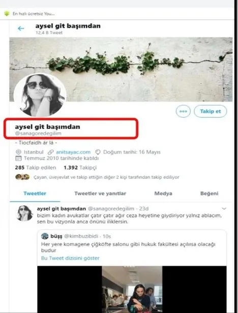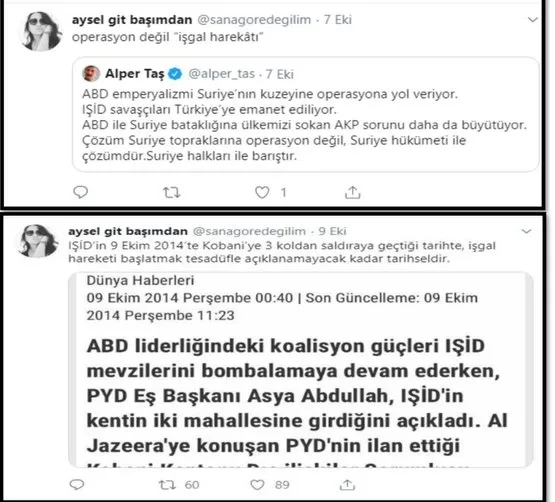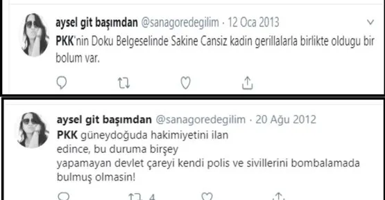 @sanagoredegilim hesabından "PKK güneydoğuda hâkimiyetini ilan edince, bu duruma bir şey yapamayan devlet çareyi kendi polis ve sivillerini bombalamada bulmuş olmasın!" diyerek Türkiye Cumhuriyeti Devleti'ni ve devletin polisini karalayıcı yazılar yazdığı da görüldü. Ayrıca aynı Twitter hesabından PKK terör örgütünü övücü tweetler attığı dikkat çekti: "Önce PKK bitirilecekmiş, bölgede ekonomik, sosyal önlemler alınacakmış. Karşınızda Ortadoğu'nun en büyük halk hareketi var. Hâlâ ne diyonuz la!" dedi.