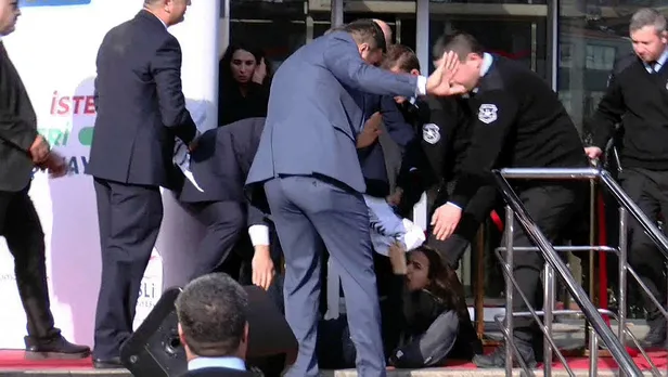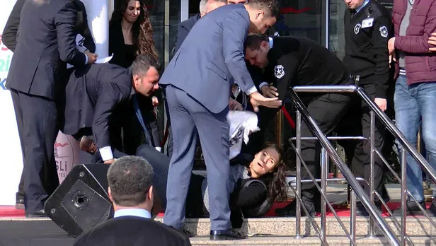 Kadına güvenlik görevlileri ve korumalar müdahale etti. Bu sırada yere düşen kadın korumalar ve güvenlik görevlileri tarafından yerden kaldırılarak sahneden çıkarıldı.