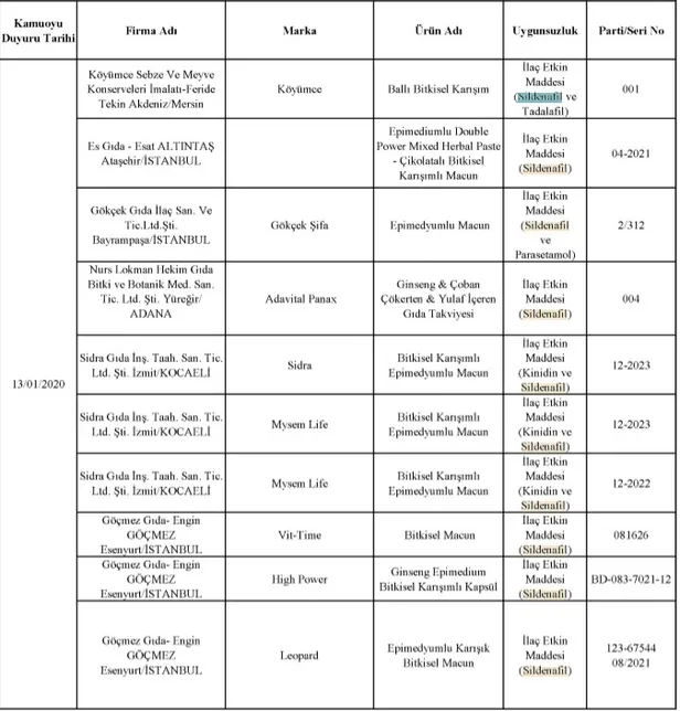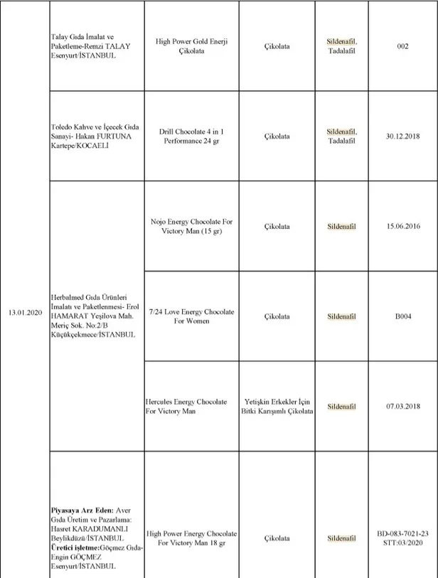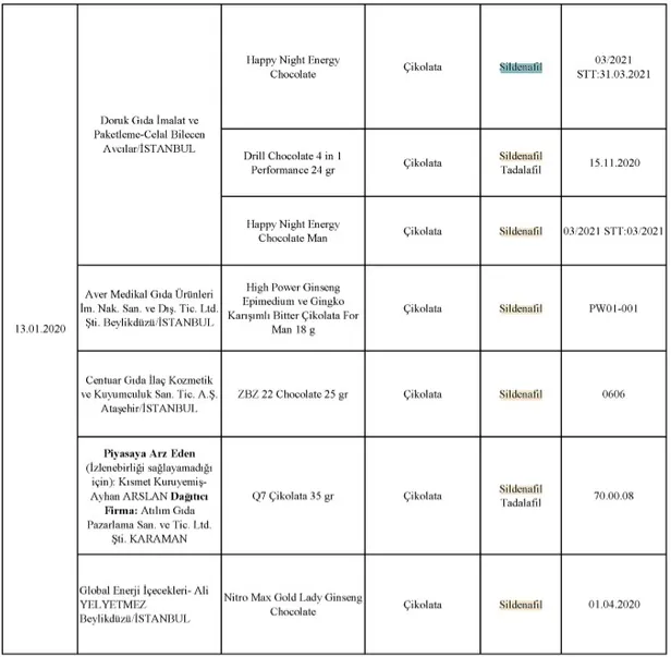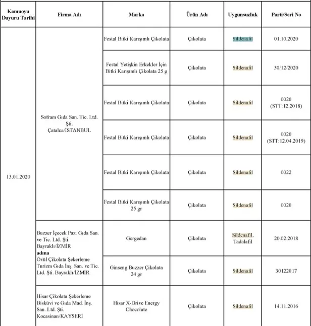 Sildenafil ve tadalafil nedir, ne işe yarar? Tarım ve Orman Bakanlığı tarafından taklit, tağşiş yapıldığı veya ilaç etken maddesi ilave edildiği tespit edilen toplam 229 firmaya ait 386 parti ürünün listesi paylaşıldı. Bu ürünler arasında çikolata ürünlerinde sildenafil ve tadalafil etken maddelerinin kukllanıldığı öğrenildi. Peki, Sildenafil ve tadalafil nedir, ne işe yarar? Sildenafil zararları neler? İşte cevaplar...