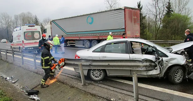 Düzce TEM Otoyolunda kontrolden çıkan otomobilin bariyere saplanması sonucu meydana gelen trafik kazasında yaralı sürücü bariyerlerin kesilmesi sonucu kurtarıldı. Kazayı izlemek isteyen bir başka aracın sürücüsü ise bariyerlere çarpan otomobili içinde sıkışarak yaralandı.