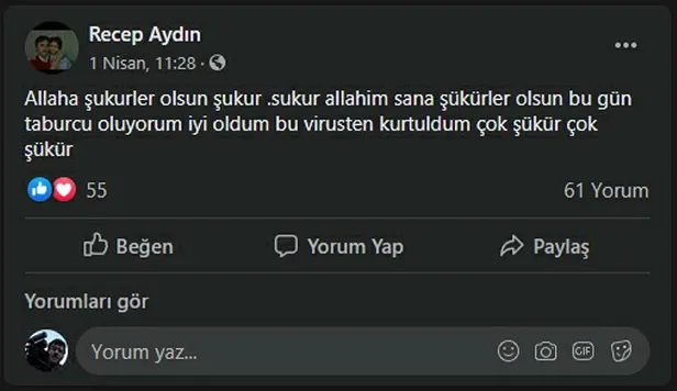 Aydın, bir başka paylaşımında ise "Allaha şükürler olsun şükür. Şükür Allah'ım sana, şükürler olsun. Bugün taburcu oluyorum. İyi oldum. Bu virüsten kurtuldum. Çok şükür, çok şükür" ifadelerini kullandı.