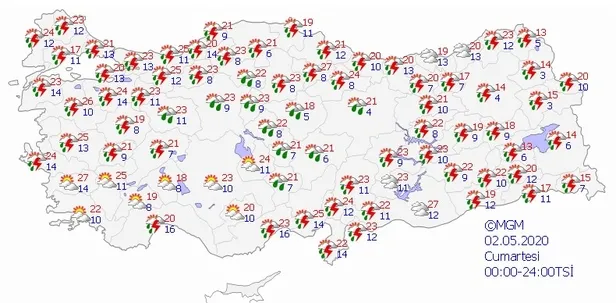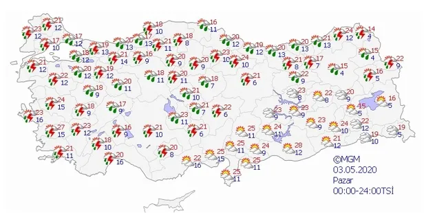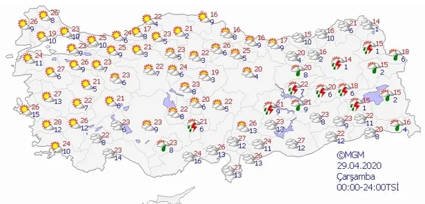 Meteoroloji Genel Müdürlüğü tarafından yapılan son değerlendirmelere göre: ülkemiz genelinin parçalı ve yer yer çok bulutlu, öğle saatlerinden sonra Doğu Anadolu, Niğde ve Karaman çevreleri ile Doğu Akdeniz'in iç kesimlerinin hafif sağanak ve yer yer gök gürültülü sağanak yağışlı geçeceği tahmin ediliyor.