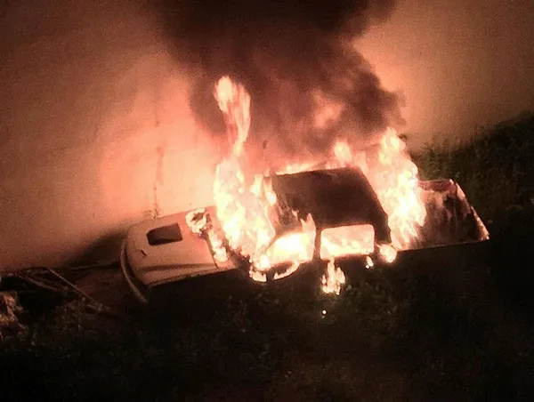 Sivas'ta boş arsada park halinde bulunan kamyonet alev alev yandı