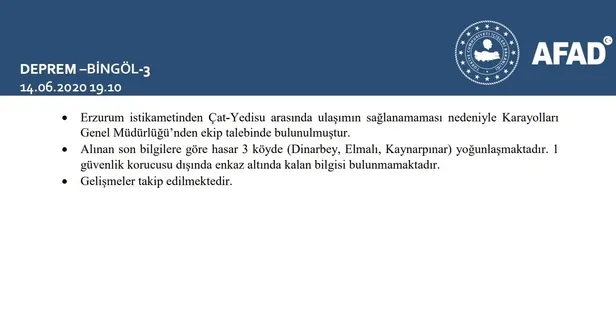 "Dinarbey-Malkoç yaylasında 2, Elmalı köyünde ise 3 vatandaşımız göçük altından kurtarılmıştır. Göçük altından kurtarılan vatandaşlarımızın sağlık durumlarında ciddi bir durum olmayıp, hastaneye sevk edilmiştir. Hasarların tespit edildiği köylerimize ilk etapta ivedi olarak Bingöl AFAD'dan arama-kurtarma araçları ve personelleri sevk edilmiştir. Ayrıca Erzurum, Diyarbakır, Muş, Malatya ve Tunceli illerimizden de arama kurtarma ekipleri deprem bölgesine sevk edilmek üzere yola çıkmıştır."