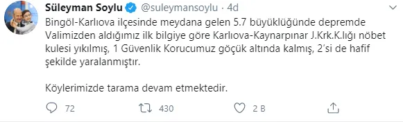 İçişleri Bakanı Süleyman Soylu, "Bingöl-Karlıova ilçesinde meydana gelen 5.7 büyüklüğünde depremde Valimizden aldığımız ilk bilgiye göre Karlıova-Kaynarpınar J.Krk.K.lığı nöbet kulesi yıkılmış, 1 Güvenlik Korucumuz göçük altında kalmış, 2'si de hafif şekilde yaralanmıştır. Köylerimizde tarama devam etmektedir." dedi.