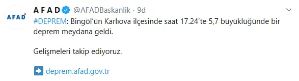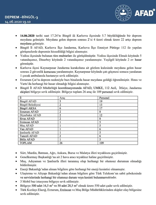 AFAD'ın Twitter hesabından, Bingöl'ün Karlıova ilçesinde meydana gelen 5.7 büyüklüğündeki deprem ile ilgili yapılan açıklamada, "5,7 büyüklüğündeki depremde, Bingöl Karlıova ve Yedisu ilçelerindeki köylerde 2 evin hasar gördüğü, farklı köylerde 8 vatandaşımızın yaralandığı tespit edilmiştir. Yaralı 2 güvenlik korucumuzdan biri enkaz altında kalmıştır. Bölgeye, 109 kişiden oluşan AFAD, UMKE, 112 Acil, İtfaiye, Jandarma ekipleri 26 araçla sevk edilmiştir. Bölgede arama kurtarma ve köylerde tarama faaliyetleri sürmektedir." denildi.
