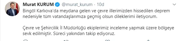 Çevre ve Şehircilik Bakanı Murat Kurum, Bingöl'de meydana gelen 5.7'lik depremle ilgili, "Bingöl Karlıova'da meydana gelen ve çevre illerimizden hissedilen deprem nedeniyle tüm vatandaşlarımıza geçmiş olsun dileklerimi iletiyorum. Çevre ve Şehircilik İl Müdürlüğü ekiplerimiz inceleme yapmak üzere bölgeye sevk edilmiştir. Süreci yakından takip ediyoruz." açıklamasında bulundu.