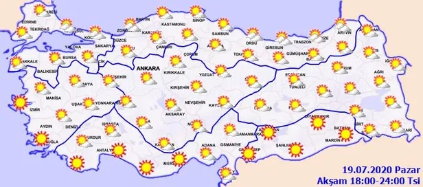 Meteoroloji Genel Müdürlüğü tarafından yapılan son değerlendirmelere göre: Ülkemizin kuzey kesimlerinin parçalı ve yer yer çok bulutlu, yarın Trakya ve Batı Karadeniz (Sinop hariç) ile İstanbul'un kuzey ilçeleri, Sakarya ve Kocaeli çevrelerinin yerel olmak üzere sağanak, Batı Karadeniz'in iç kesimlerinin yer yer gök gürültülü sağanak yağışlı, diğer yerlerin az bulutlu ve açık geçeceği tahmin ediliyor.. Peki İstanbul, Ankara ve İzmir'de hava nasıl olacak? İşte, 20 Temmuz il il hava durumu tahminleri...